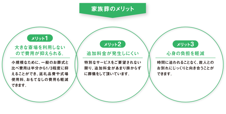 家族葬は身内だけで執り行う葬儀。そのため、参列者への引き出物やお礼状を用意する必要もないので、葬儀費用を抑えることが可能です。